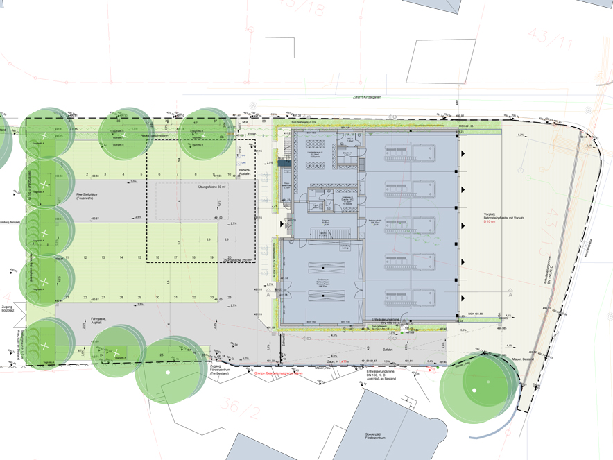 Die Freianlagenplanung unterliegt den funktionalen Anforderungen einer Feuerwache und zeichnet sich daher durch seine klaren Zuordnungen und Geradlinigkeit aus.