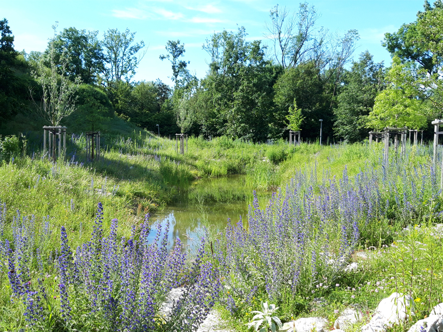 Der Retentionsteich ist im unteren Bereich mit Lehm gedichtet, so dass hier dauerhaft Wasser gestaut werden und sich eine natürliche Biotopstruktur entwickeln kann. Die höheren Ufer sind wasser-durchlässig gestaltet, so dass bei Starkregenereignissen eine Versickerung in den natürlichen Boden gewährleistet wird.