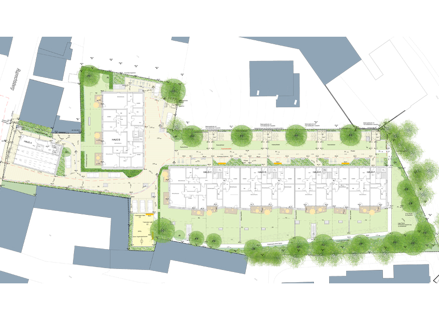 Grundidee der Freiflächenplanung ist es, den Gebäuden eine gleich-artige, vielfältig nutzbare Erschließungszone zuzuordnen. In dem durch die Anordnung der Gebäude entstehenden Innenhof, mit seiner wohnstraßenartigen Raumsituation und der abwechs-lungsreichen Raumfolge, wird ein gemeinschaftlich nutzbarer, kommunikativer Ort für die Anwohner geschaffen. Eingelagert in diese Raumabfolge ist als Herzstück eine hofartige Mitte, welche auch den Spielbereich für Kleinkinder aufnimmt.