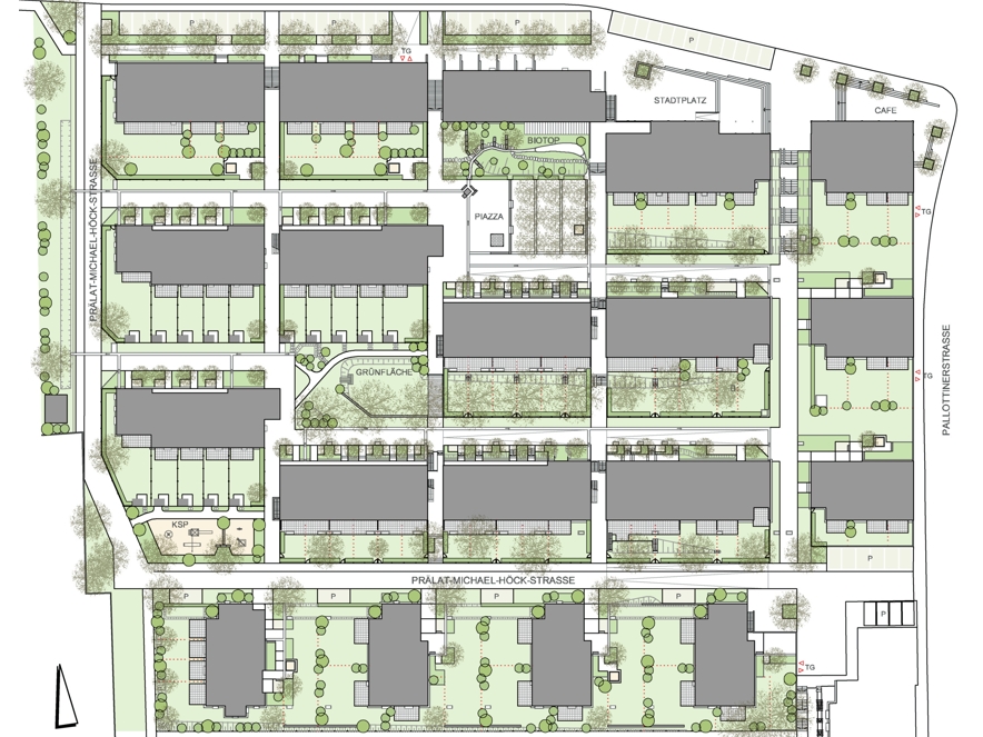 Die Wohnanlage wurde in vier Bauabschnitten innerhalb von 5 Jahren durchgeführt. An den Kreuzungspunkten der Erschließung entstehen vier Quartiersplätze, die als Stadtplatz, Piazza mit Baumdach, Spielwiese und Kinderspielplatz für vielfältige Nutzungen gestaltet sind. Das Wohngebiet ist geprägt durch den erhaltenen Großbaumbestand und die umfangreichen Neupflanzungen. Die Entwässerung erfolgt über offene Granitrinnen. Durch das abfallende Gelände ergibt sich eine abwechslungsreiche Freiflächengestaltung.