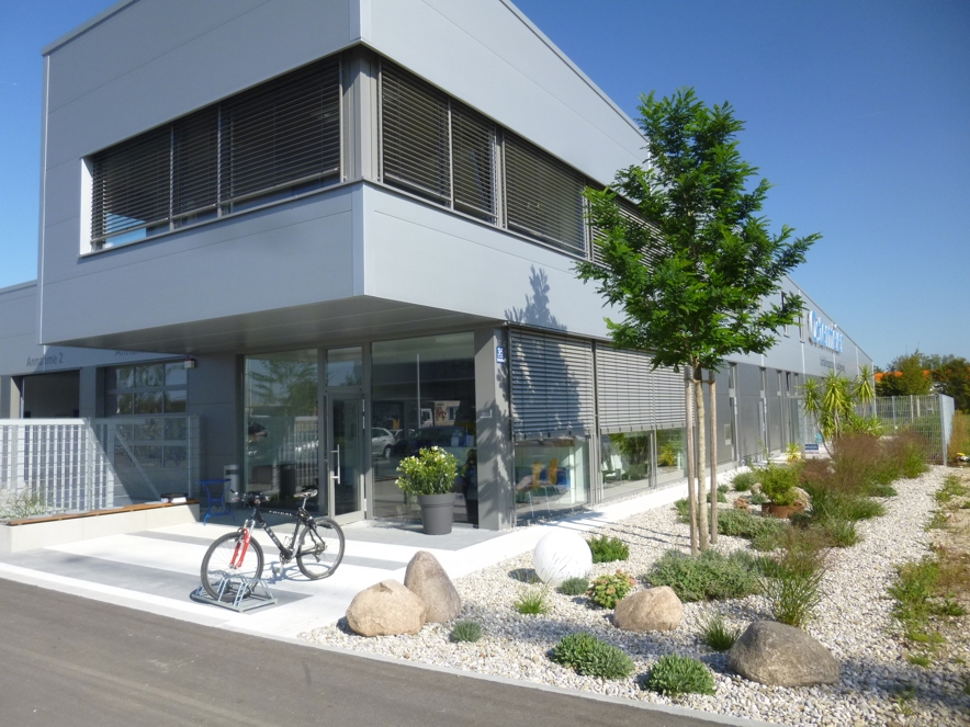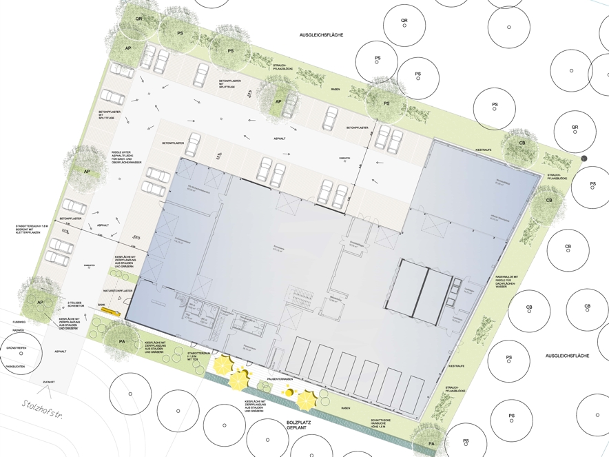 In der Stolzhofstraße in München, Trudering, wurde eine neue Lackiererei mit Unfallinstandsetzung gebaut. Die Außenanlagen sind auf die Nutzungen dieser Dienstleistung angepasst. Der Übergang zu den Ausgleichsflächen wurde durch eine dichte Strauchpflanzung hergestellt. Für die Erholung der Mitarbeiter wurde eine großzügige Terrasse mit anschließendem Kiesbeet geplant.