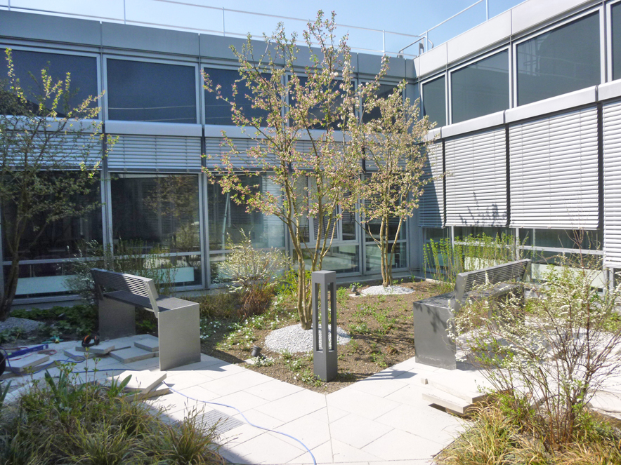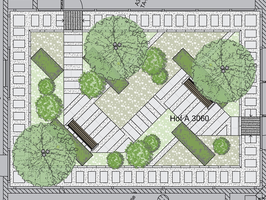Das Ziel der Baumaßnahme war, die überalteten Innenhöfe im 2. Obergeschoß zu sanieren. Die begehbaren Innenhöfe sind durch die Neugestaltung wieder besser nutzbar und erlebbar. Für jeden der sechs Innenhöfe wurde ein Blühkonzept entwickelt. Zwei der sechs Höfe wurden als barrierefreie Höfe und einer davon als Raucherhof mit Raucherpavillon ausgebildet.