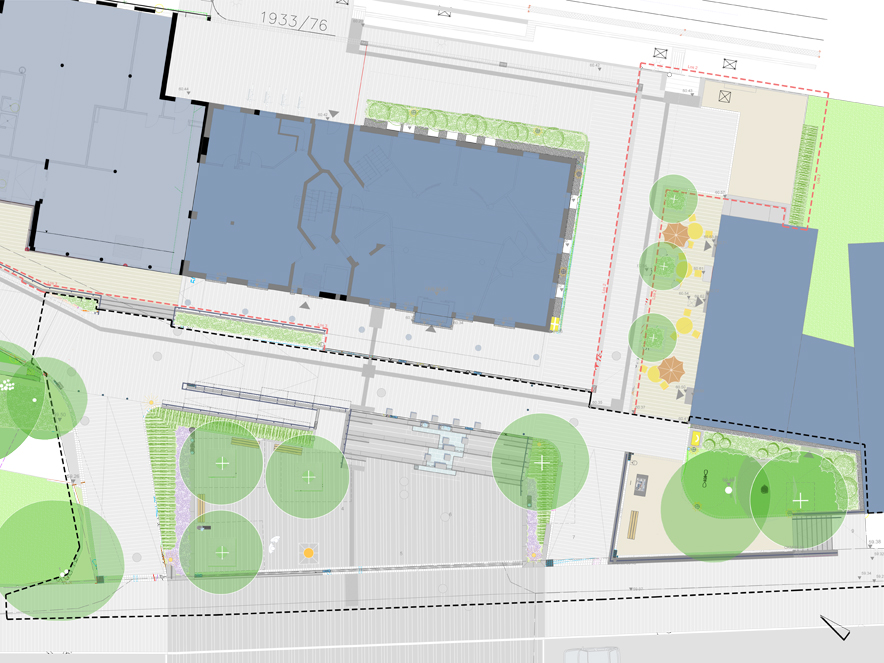 Ziel der Planung war die Schaffung eines barrierefreien Platzes mit Anbindung an die angrenzenden Geschäftsgebäude und Bahnsteig mit hoher Aufenthaltsqualität. Zur Überwindung der natürlichen Topografie wurde eine Rampenanlage und eine Sitzstufenanlage mit Brunnen erschaffen. Diese Bauwerke zusammen mit raumbildenden Hecken umfassen die neu geschaffene ebene Platzfläche, auf welcher unterschiedliche Veranstaltungen wie Maibaumfest oder ein Weihnachtsmarkt stattfinden können. Der neue Bahnhofsvorplatz dient als Ort der Begegnung und Aufenthalt mit verbesserter Infrastruktur der verschiedenen Nutzer.