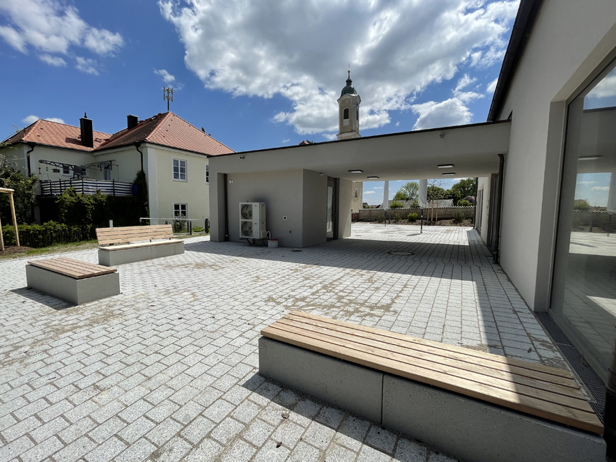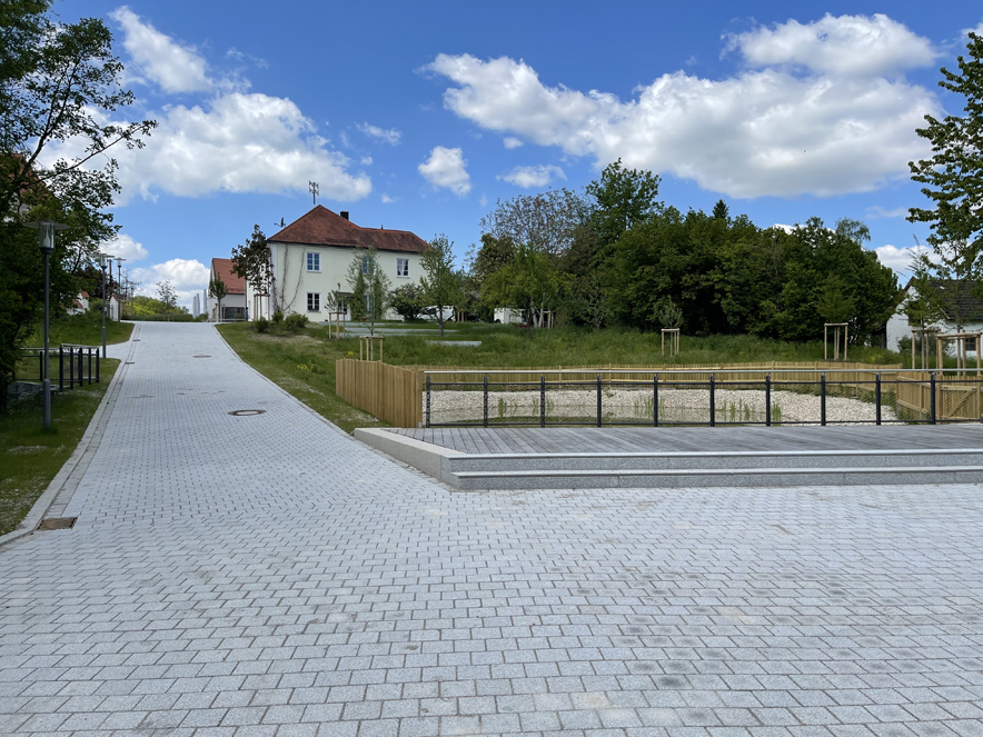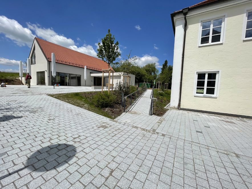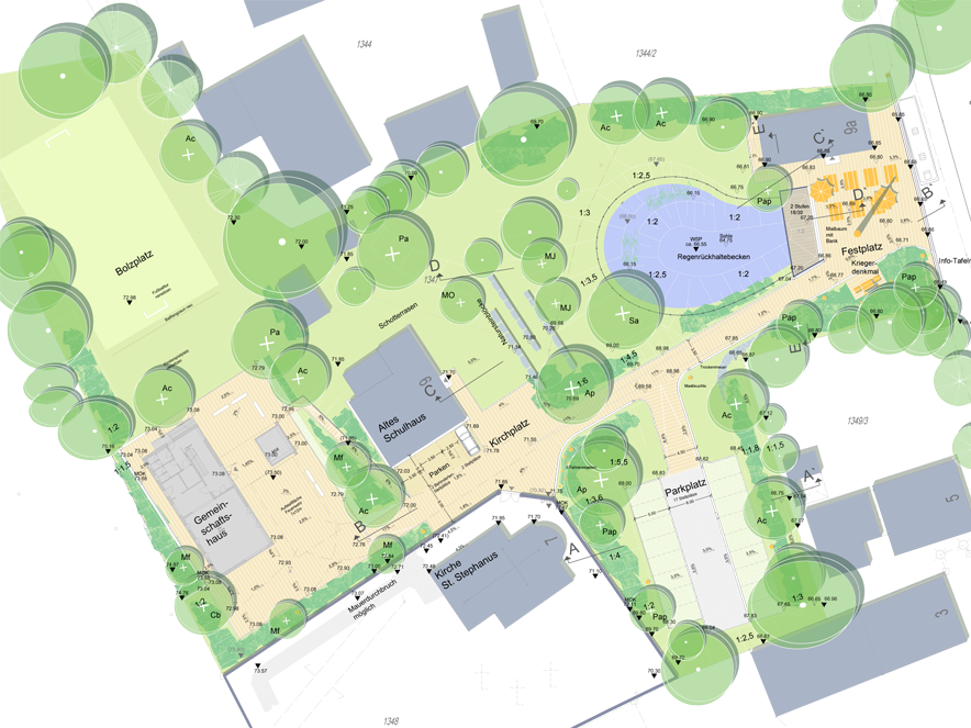 Zentraler Ausgangspunkt ist die Errichtung eines Gemeinschaftshauses. Durch das harmonische Zusammenspiel von Neuplanung und integrierender Umgestaltung des Bestandes entstehen zwischen Pfarrhaus, Kirche, Altem Schulhaus und neuem Gemeinschaftshaus nicht nur multifunktional nutzbare Flächen mit hoher Aufenthaltsqualität, es ergibt sich auch die Chance, einen städtebaulichen Schwerpunkt zu schaffen, der im besten Fall zu einer neuen Ortsmitte verschmilzt.