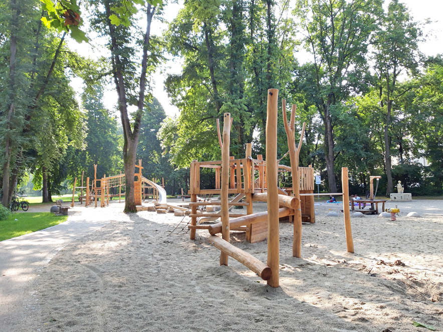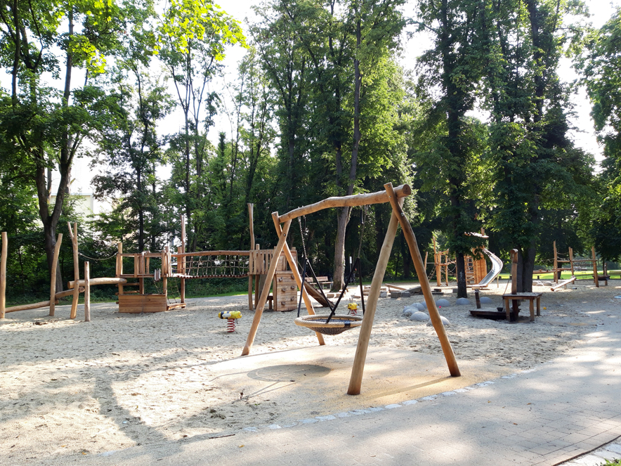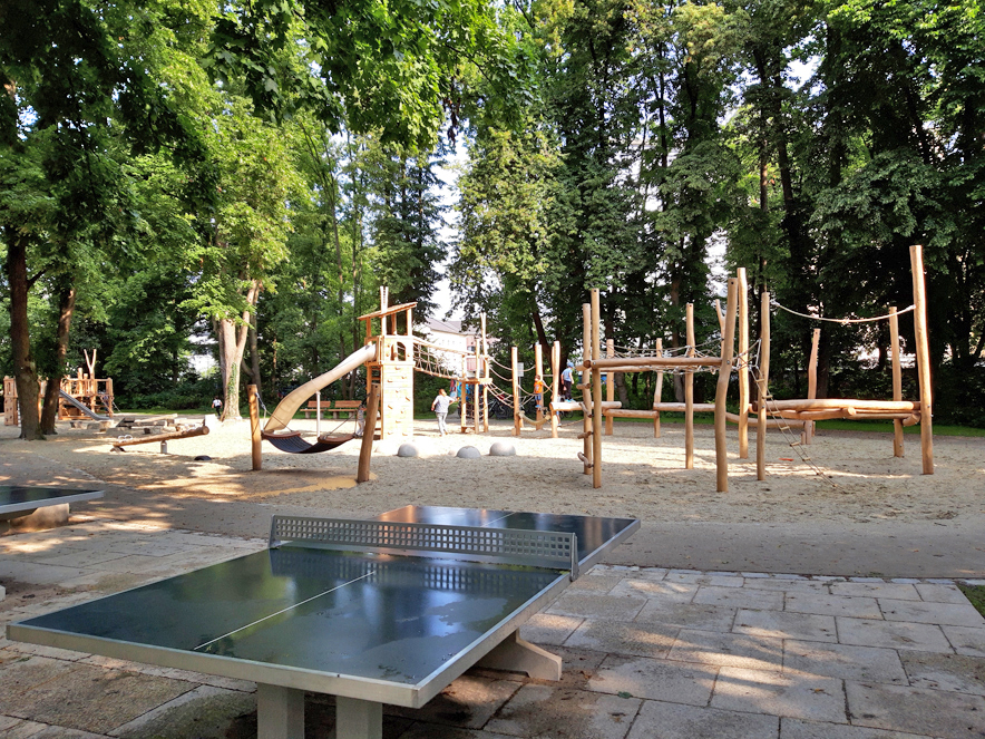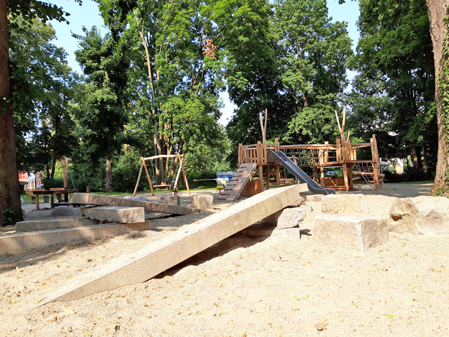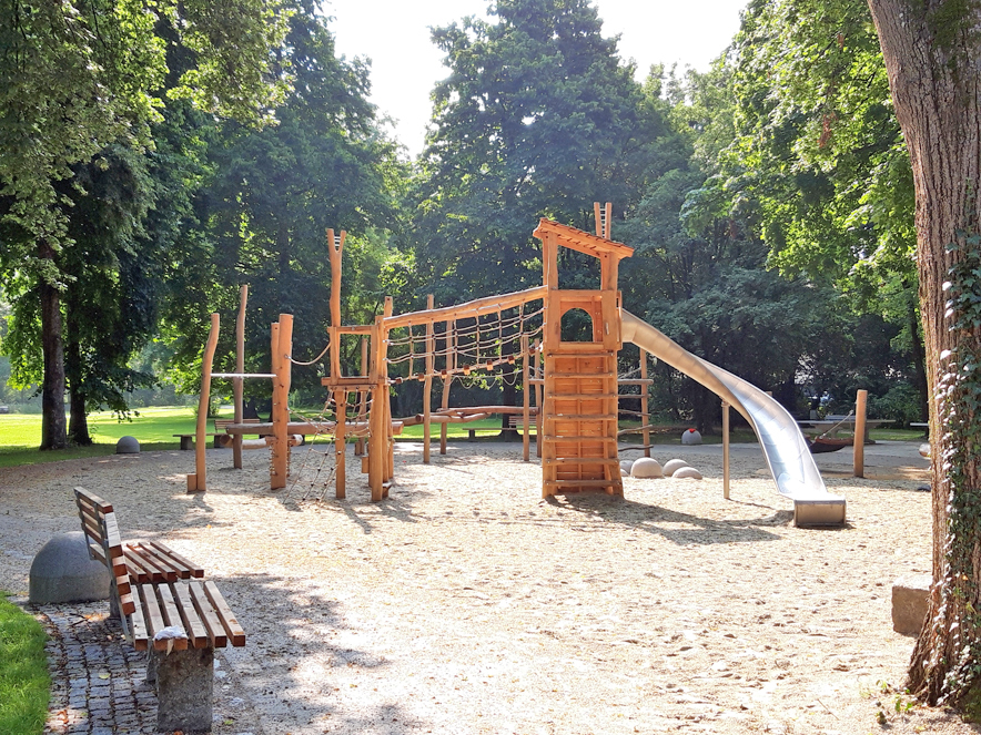 Aufgrund des Baumbestandes lag hier die Entwicklung eines Waldspielplatzes nahe. Unter Berücksichtigung des Baumbestandes sieht das planerische Konzept eine zusammenhängende Spielfläche vor, welche durch eine vielfältig nutzbare „Umlaufbahn“ gefasst wird. Die Spiellandschaft wird durch zwei größere Kletteranlagen geprägt. Schaukeln, Wippen, Tischtennisplatten und ein Sand-Matsch-Bereich runden das Spielangebot ab.