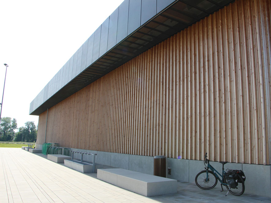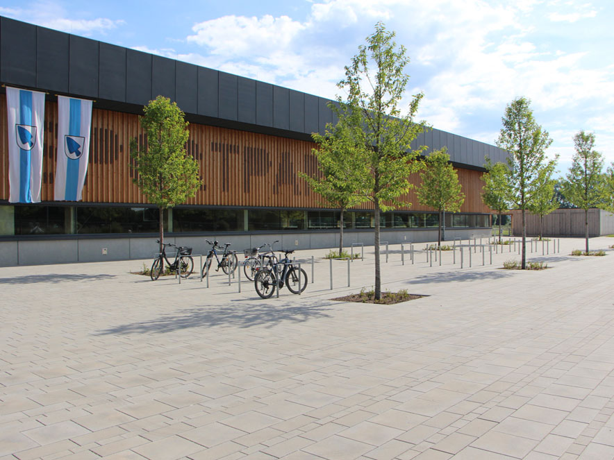 Im Zentrum der Anlage sitzt die geplante 3-fach-Sporthalle mit Funktionsgebäude an einem großzügigen, baumüberstellten Vorplatz, welcher der Erschließung und Pflege sowie als Parkareal für Fahrräder und 2-Räder dienen soll. Daran schließen sich nach Norden vier Sportfelder an. Im Süden liegt ein Footballfeld, welches ebenfalls neu angelegt werden soll. Nach Norden und Osten hin sind den Sportfeldern Ausgleichsflächen vorgelagert, welche auch Retentionsmulden für die Entwässerung aufnehmen.