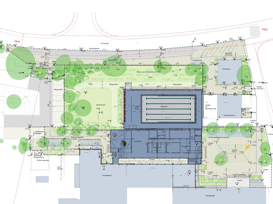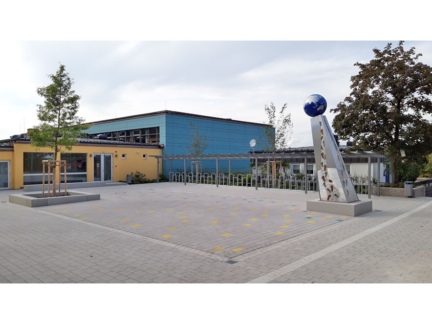 Durch die Sanierung der Sport- und Schwimmhalle an der Grund- und Mittelschule in Haag i.OB wurden auch die Freianlagen neu strukturiert und geordnet. Die Schwimmhalle bekam einen neuen großzügigen, barrierefreien Zugangsbereich inklusive überdachte Fahrradständer. Um die Schwimmhalle wurden die Grünflächen mit intensiven und extensiven Bereichen hergestellt. Im Weiteren wurde die Busspur barrierefrei umgebaut und mit Wartehallen ausgestattet. Der bestehende Vorplatz der Schule wurde überplant. Auch hier wurde ein besonderes Augenmerk auf die Barrierefreiheit gelegt. Zudem wurden überdachte Fahrradständer und verschiedene Sitzmöglichkeiten hergestellt.
