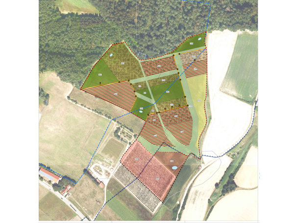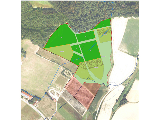 Die ehemals landwirtschaftlich ge-nutzte Fläche wurde mit autoch-thoner Pflanzware und Saatgut be-grünt. Im Bereich der Kuppe wurde ein „dreivierteloffener“ Hutewald mit artenreicher Bodenvegetation entwickelt. Sonderstandorte wie Versickerungsmulden und Sing-warten für die Heidelerche mit Nistkästen bereichern die Fläche. Nach der Fertigstellung erfolgten eine Funktionskontrolle und Dokumentation. Die Ökokonto-fläche kann für alle Eingriffe in der Naturraum-Haupteinheit Unter-bayerisches Hügelland mit Isar-Inn Schotterplatten herangezogen werden.